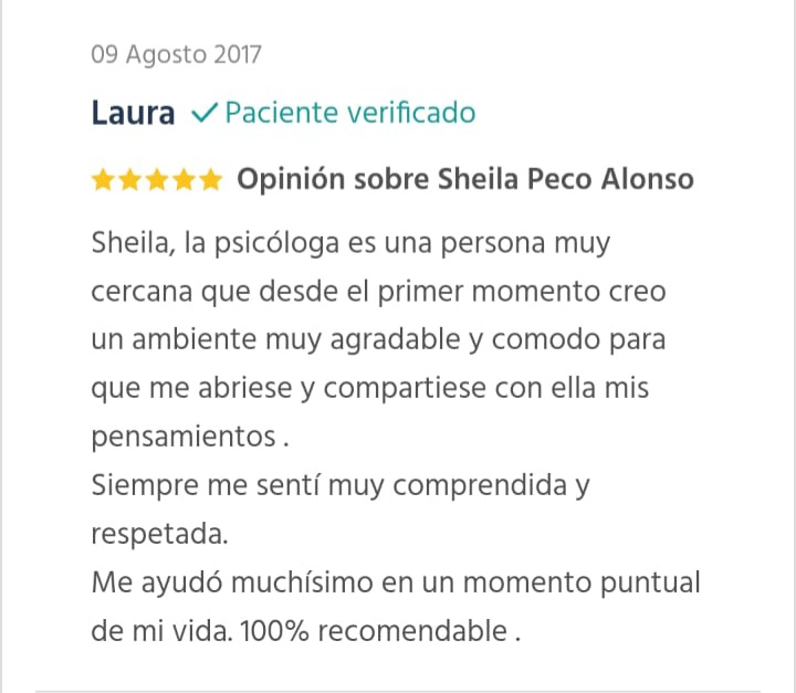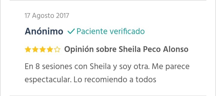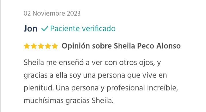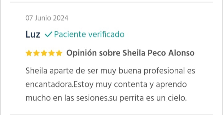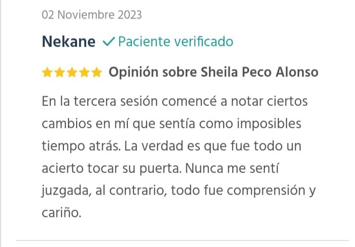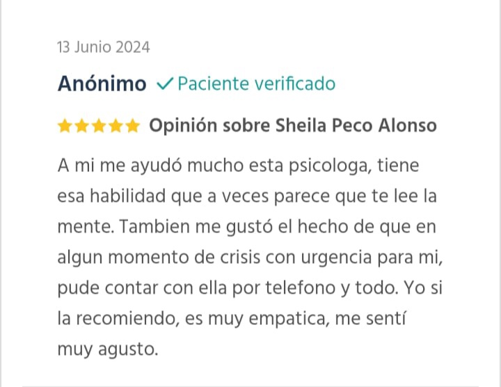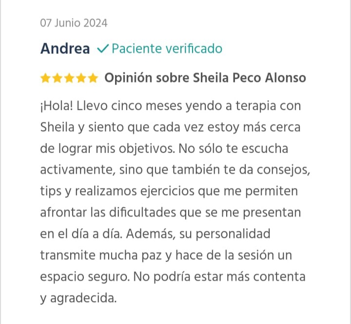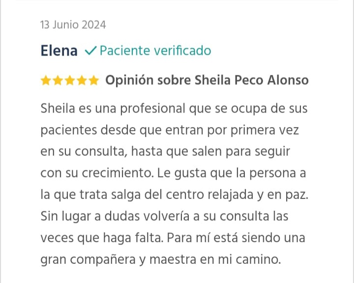 Jessica Gomez2025-07-11Trustindex verifica que la fuente original de la reseña sea Google. Es una persona muy agradable y el trato recibido por su parte es maravilloso . Estoy muy agradecida con su ayuda , la recomiendo sin dudar. Jon2025-03-28Trustindex verifica que la fuente original de la reseña sea Google. La ayuda, compromiso y atención que brinda Sheila, está a otro nivel. Dar con una persona así ha sido un gran descubrimiento. Cuando peor estaba, fue quien me tendió su mano desde el amor. Gracias mil veces, Sheila. Ana Isabel2024-12-24Trustindex verifica que la fuente original de la reseña sea Google. Sheila me parece encantadora; muy agradable,amable, sonriente,genera confianza,comunica muy bien de forma clara y empática. Además se nota que le gusta su trabajo, la psicología, que dedica tiempo para aportar todo lo que está en su mano. Todo ello la convierte en muy buena profesional. Muy recomendable. Raquel Grobas2024-10-31Trustindex verifica que la fuente original de la reseña sea Google. Súper atenta y profesional.Te da perspectivas y herramientas claras desde el principio. kristina marcos2023-10-27Trustindex verifica que la fuente original de la reseña sea Google. Muy recomendable las sesiones de Reiki con Hari. Animo a probar a cualquier persona de cualquier edad 💐💜 mari moral2023-10-20Trustindex verifica que la fuente original de la reseña sea Google. La experiencia es increíble. conectas con lo más profundo de tu ser ,sales renovada y con una energía vibrante. David muñoz villarreal david muñoz villarreal2023-10-19Trustindex verifica que la fuente original de la reseña sea Google. Excelentes profesionales pero aún mejores personas.Un trato excelente Nati Perez2023-10-19Trustindex verifica que la fuente original de la reseña sea Google. Un lugar donde desconectar, relajarte y sentirte en familia. Totalmente recomendable. Un abrazo Germán